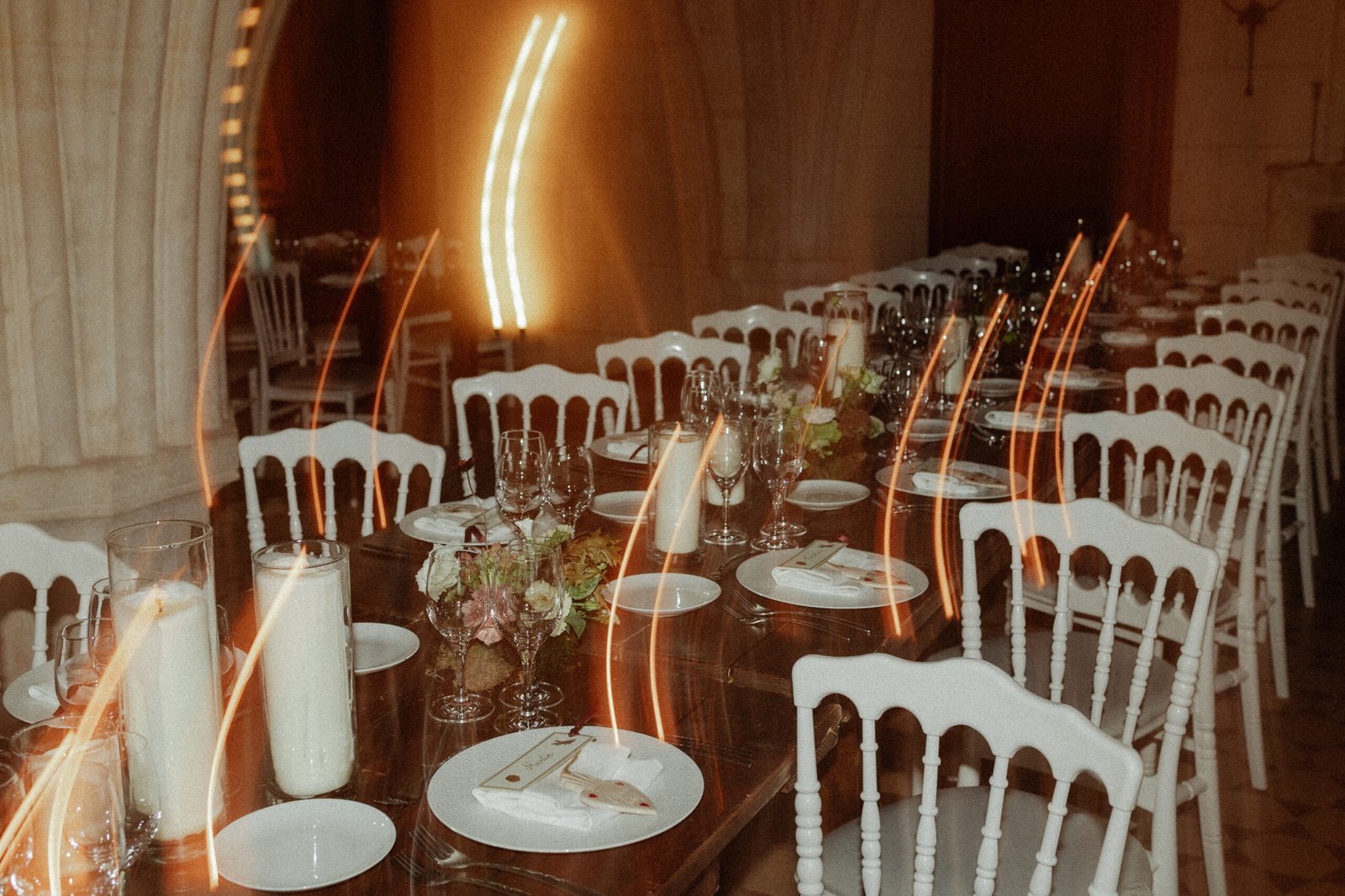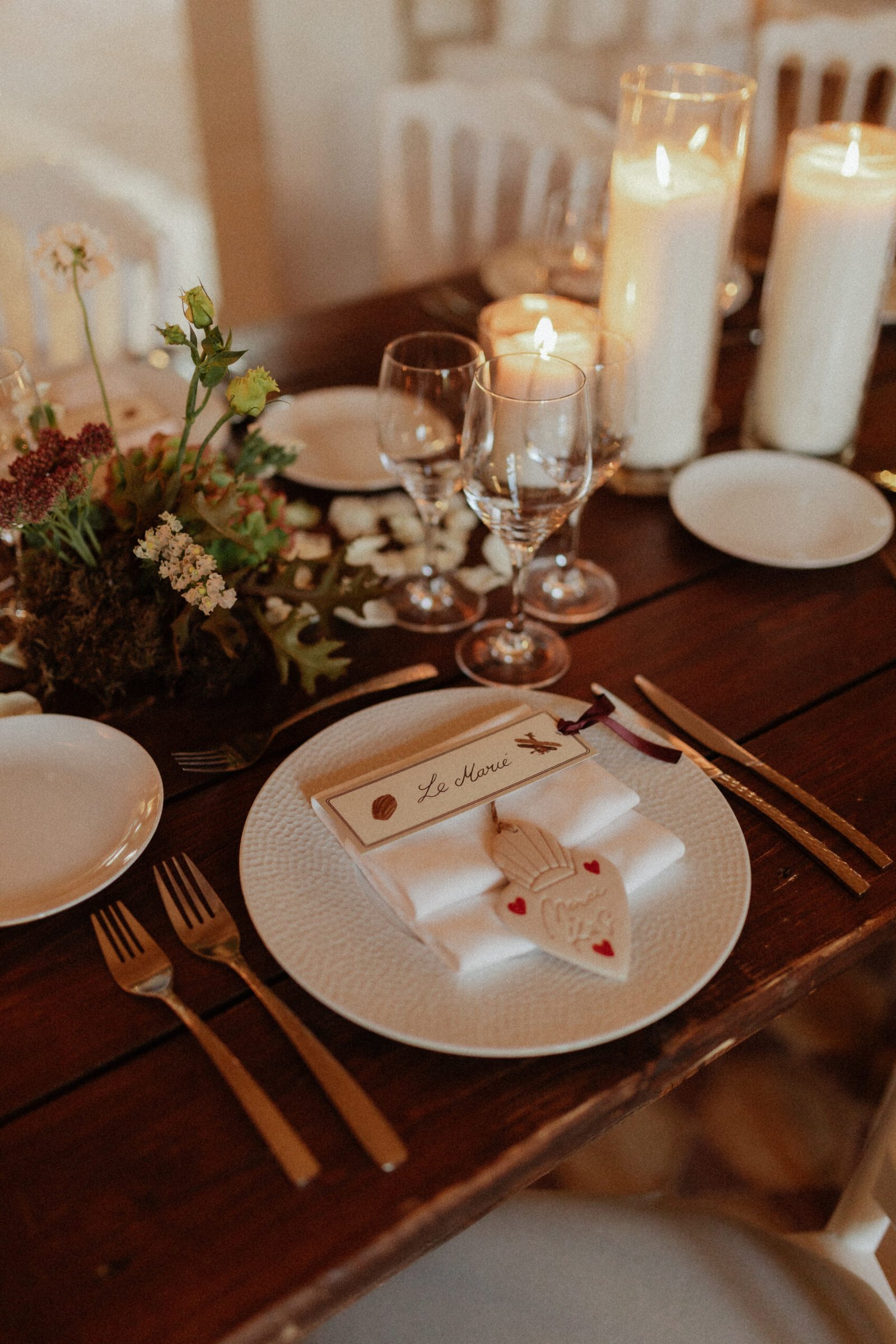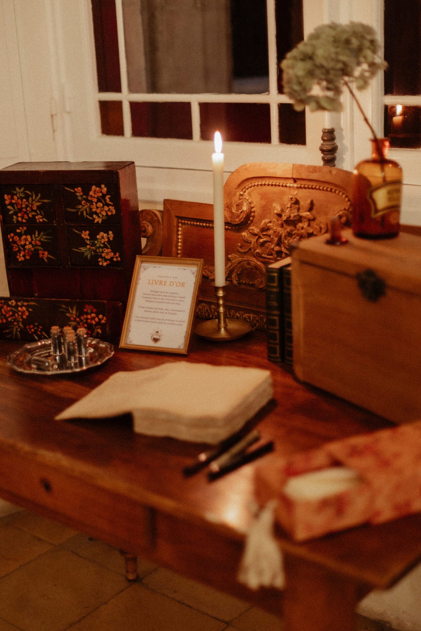 Le thème choisi par les mariés : une nostalgie élégante. Des tons doux, un peu rétro, une déco sobre mais pleine de sens. Rien d’ostentatoire — juste de la beauté simple et sincère.Les détails étaient soignés : de la papeterie artisanale aux bougies délicatement disposées, chaque élément contribuait à créer une atmosphère à la fois chaleureuse et poétique.